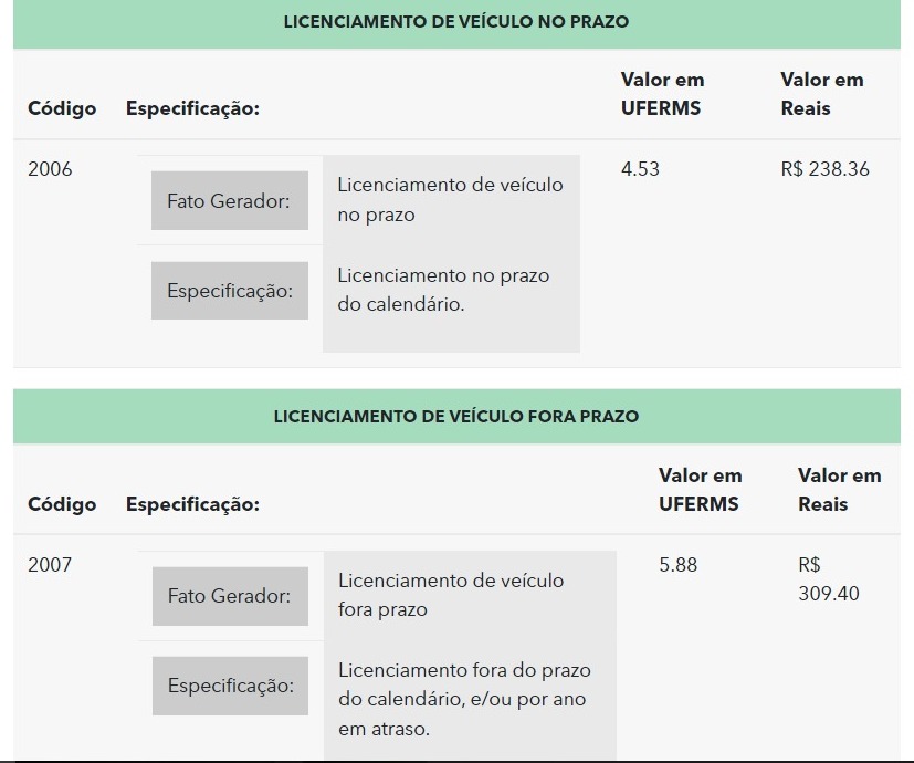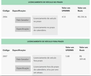 Em setembro, a taxa é de R$ 238,36, valor equivalente a 4,53 UFERMS (Unidade Fiscal Estadual de Referência). Após o vencimento, o proprietário perde o desconto de pontualidade e passa a pagar 5,88 UFERMS.